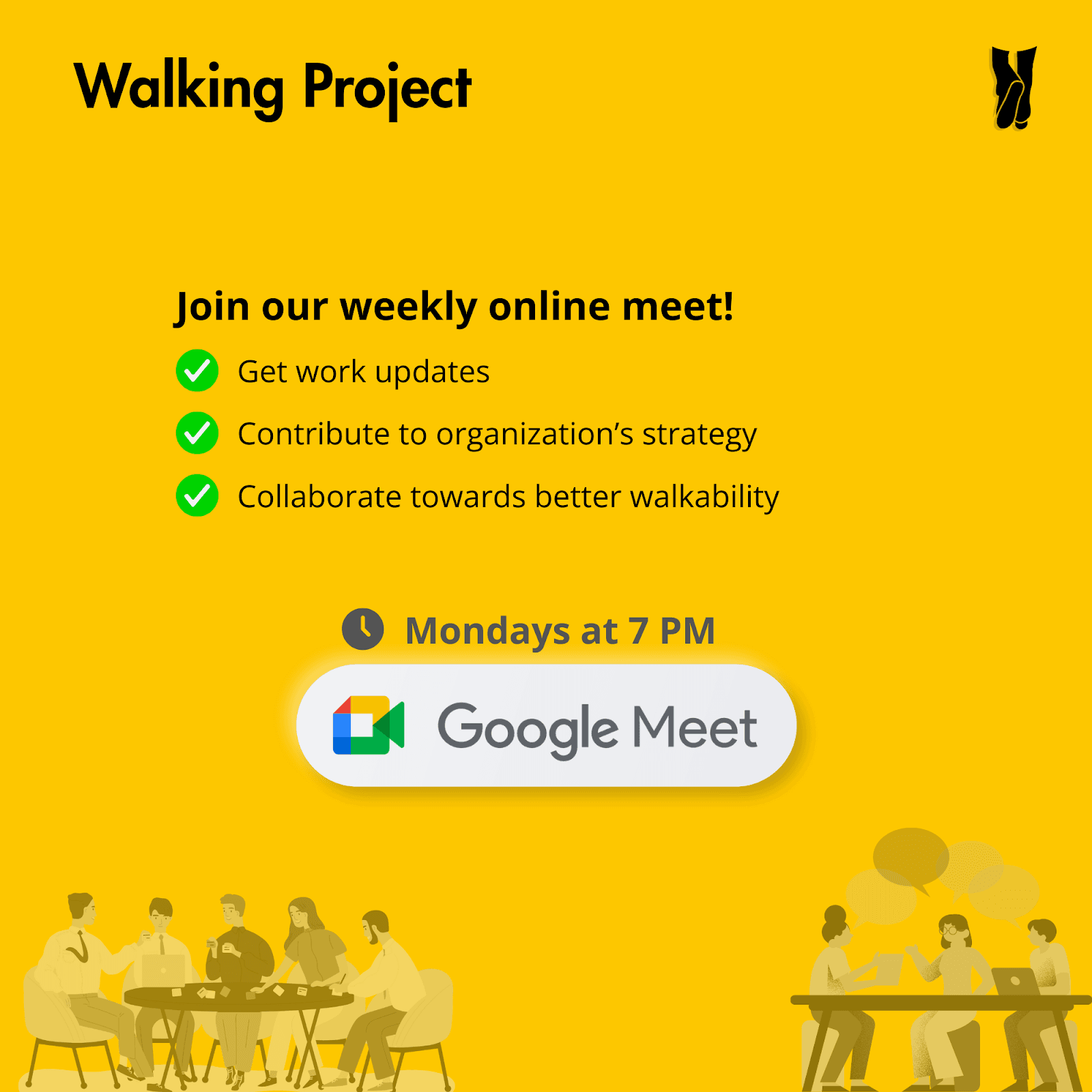 This is the link to join our weekly meeting for everyone involved with Walking Project. As a collective, we continue working towards making our cities more walkable—advocating for safer roads and better footpaths.